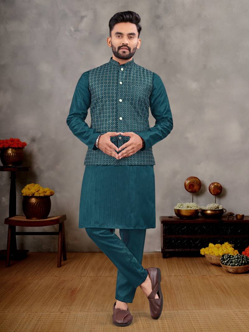 Add elegance to your festive attire with our Teal Green Art Silk Father-Son Kurta Set. Featuring intricate thread work and a comfortable readymade fit, this outfit is perfect for festivals, weddings, and traditional gatherings. Available now at Leherafashions NZ.