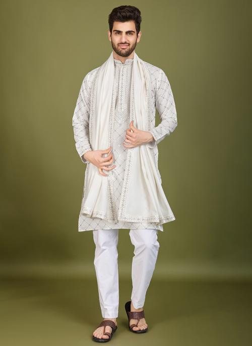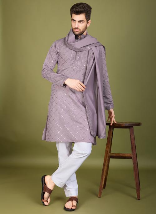 Short Description: Exude elegance in this grey viscose silk kurta pajama, designed with intricate embroidery for a sophisticated festive look. This ready-to-wear ensemble is perfect for weddings, celebrations, and traditional occasions.