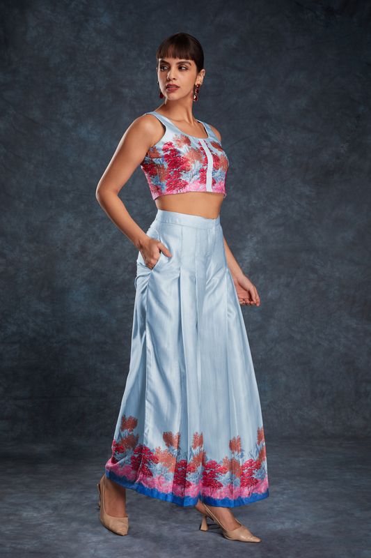 Sky Blue Satin Printed Co-Ord Set – Top & Pant