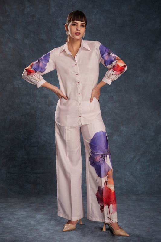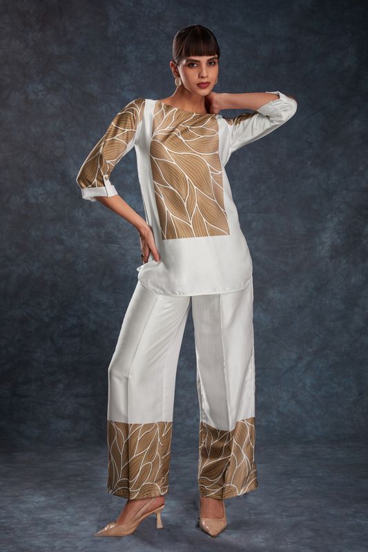 White Linen Satin Printed Co-Ord Set – Top & Pant