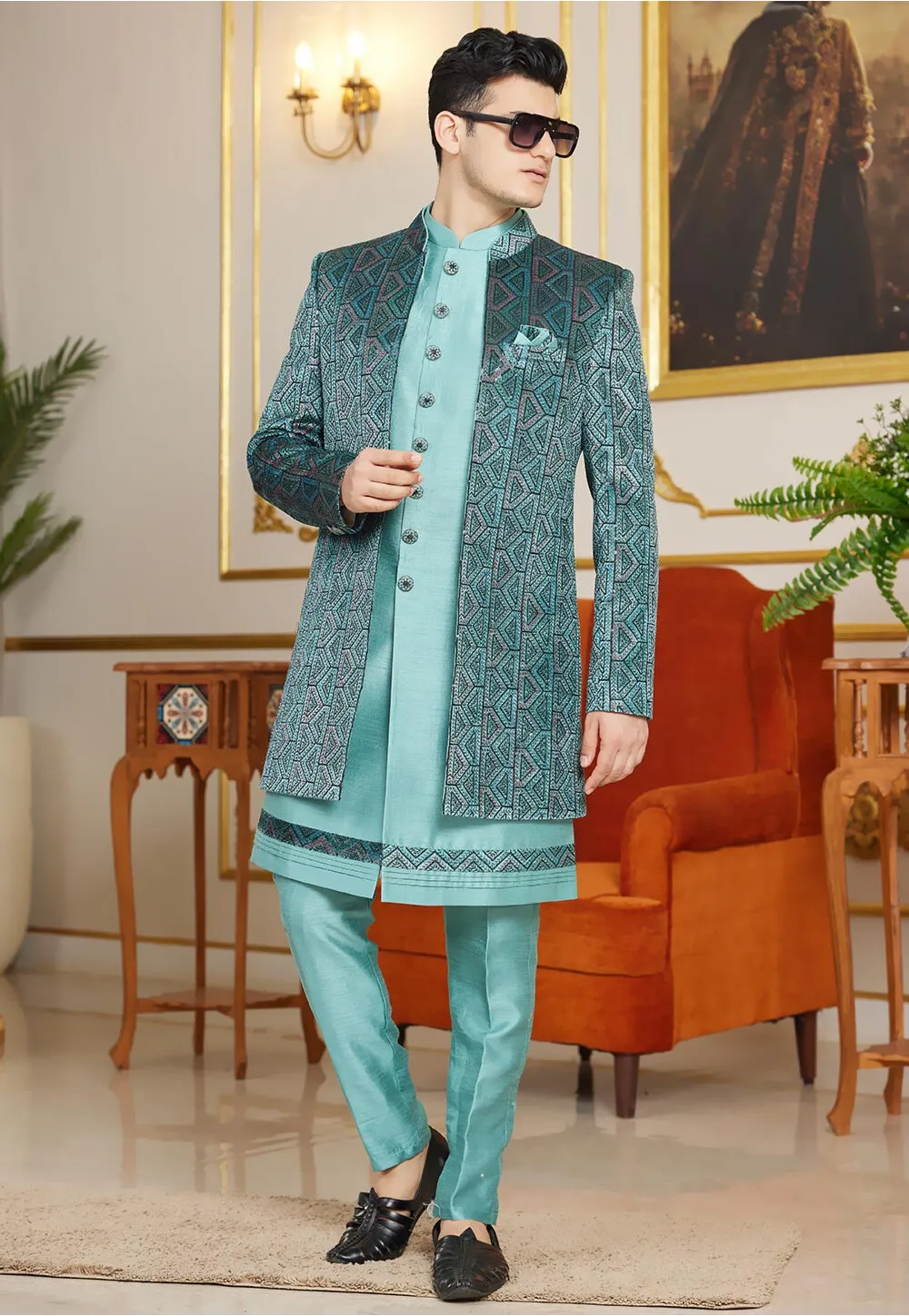 Step into sophistication with this Embroidered Art Silk Sherwani in Sea Green, designed with intricate Resham and Sequins Work. The Chinese collar and full sleeves offer a timeless look, while the long jacket adds a regal touch, making it perfect for weddings and special celebrations