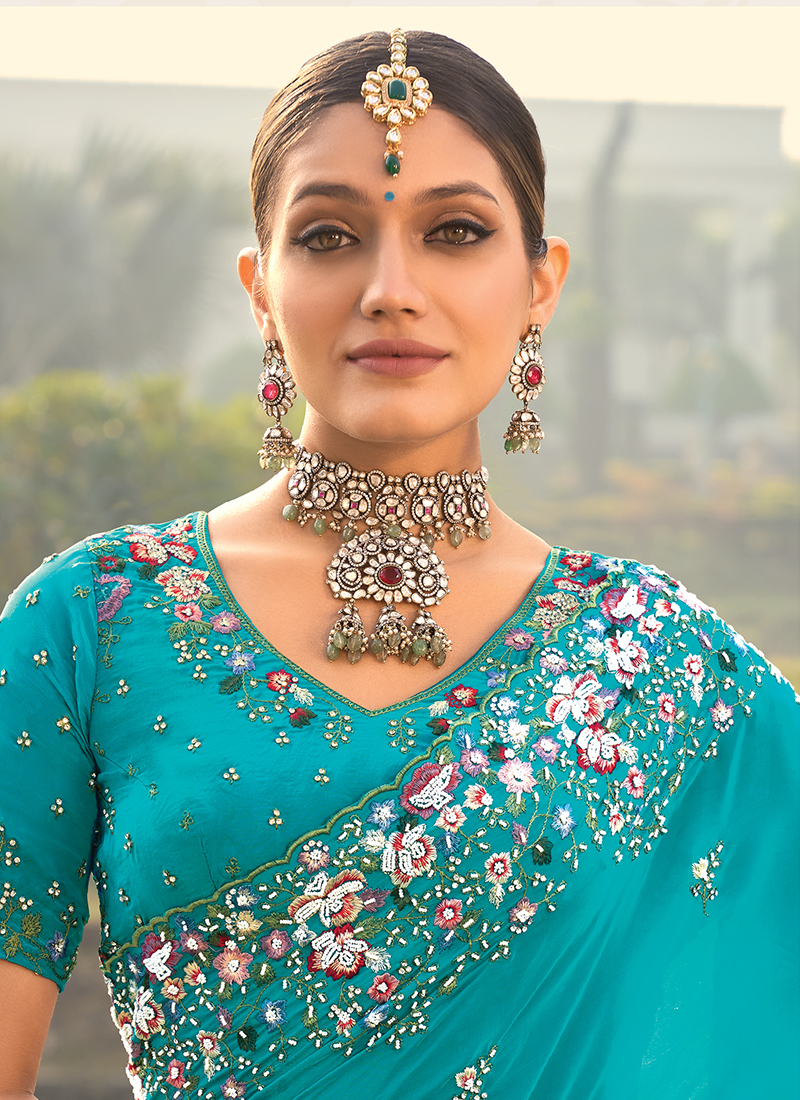 Mesmerizing Firozi Pure Crepe Cut Dana Work Wedding Saree