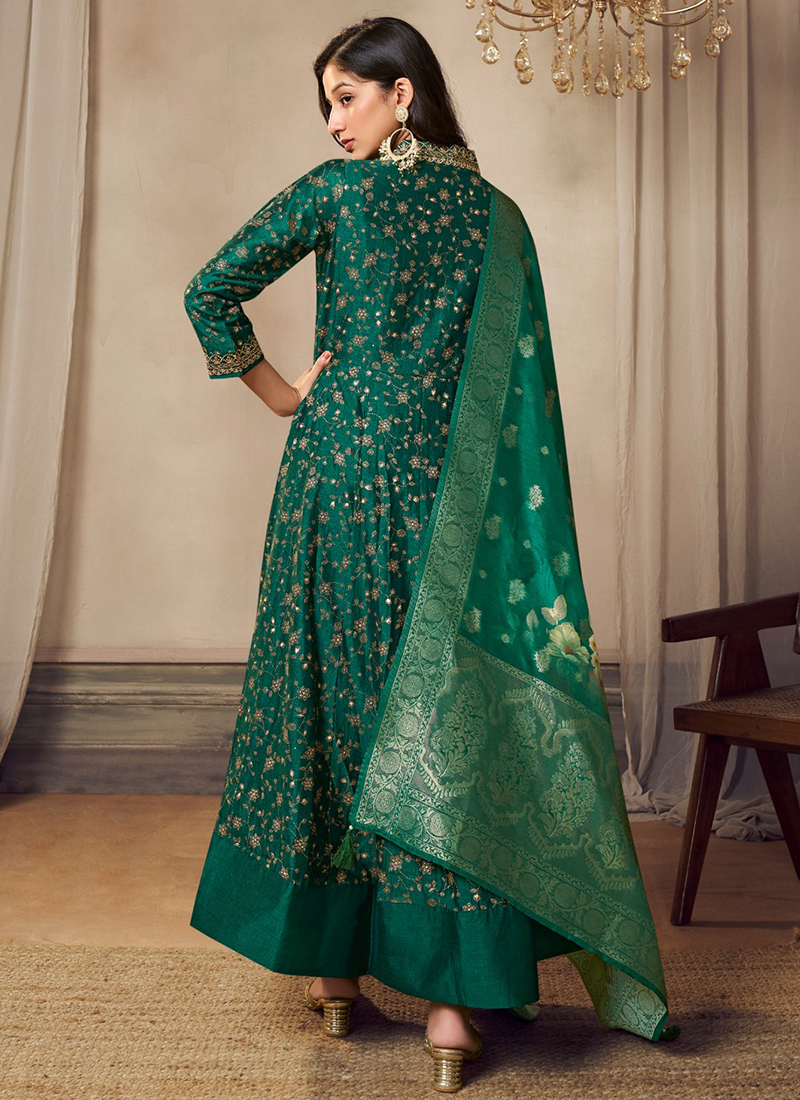 Elegant green silk Anarkali suit featuring intricate embroidery work. Perfect for parties, weddings, and festive occasions. Stylish, comfortable, and readymade for effortless charm.