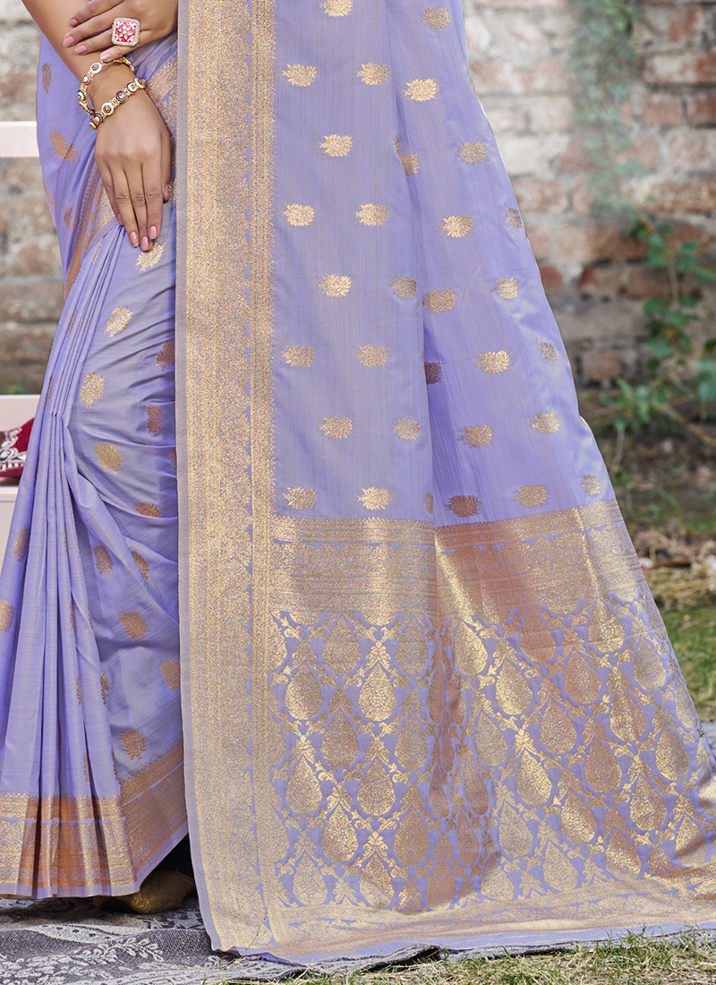 This Lavender Silk Weaving Party Wear Saree adds a touch of elegance to your look with its beautiful weaving details, making it an ideal choice for any special event.