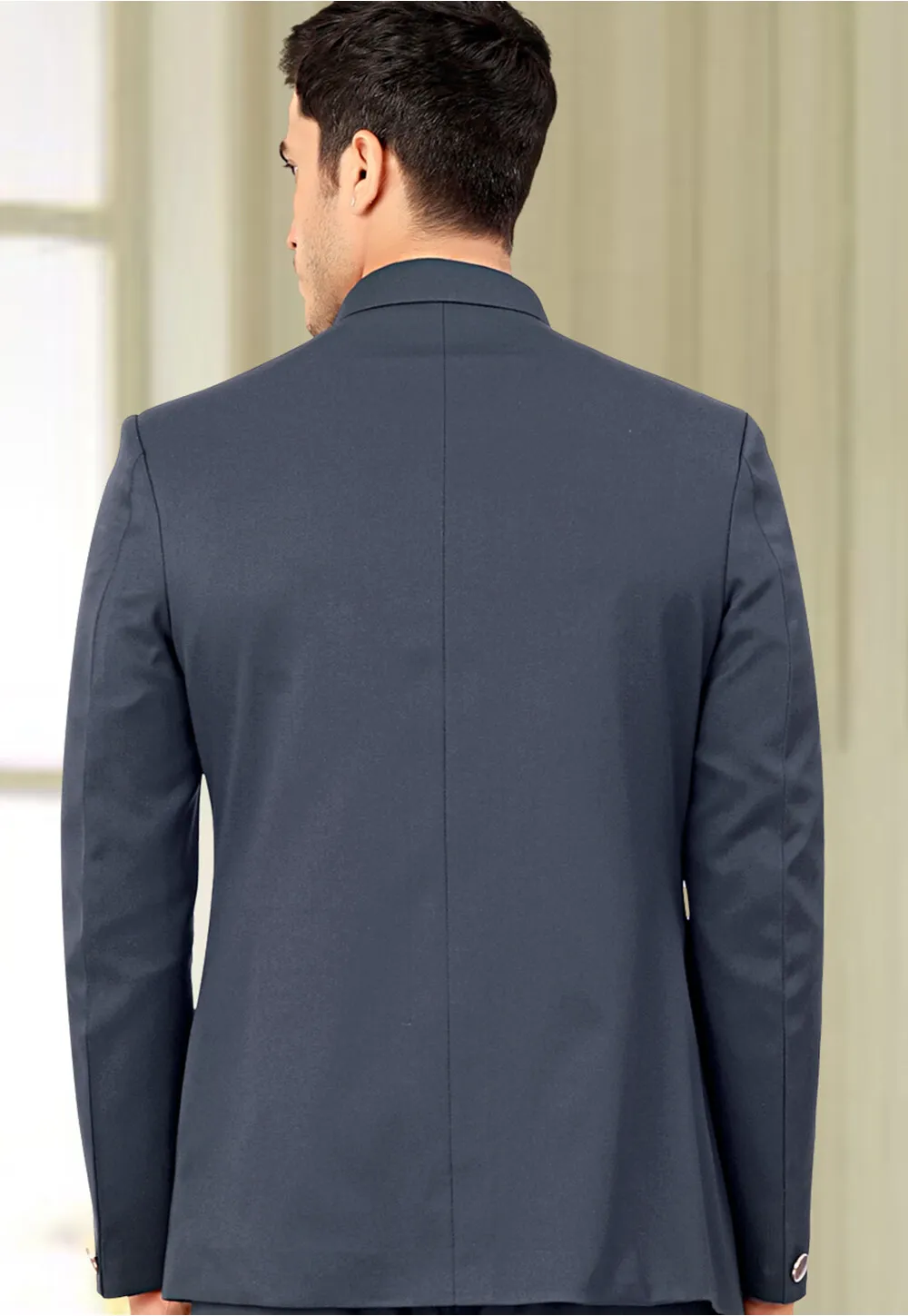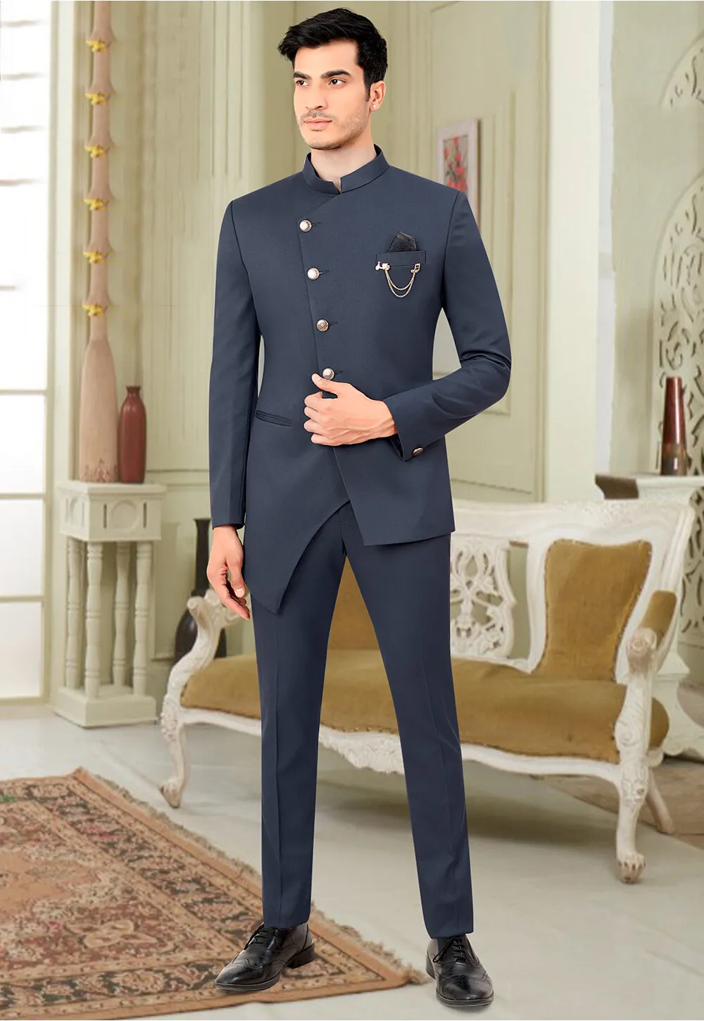 Exude elegance with this Solid Color Terry Rayon Asymmetric Jodhpuri Jacket in Dusty Blue, designed for a refined and contemporary look. The asymmetric cut adds a modern touch to this traditional classic, making it perfect for formal occasions.