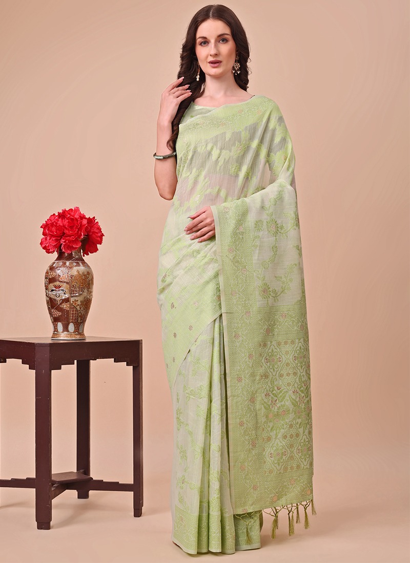 Bring fresh vibes to your ethnic look with this light green cotton saree featuring elegant floral weaving, a beautifully crafted pallu with tassels, and a breathable fabric perfect for daily and festive wear.